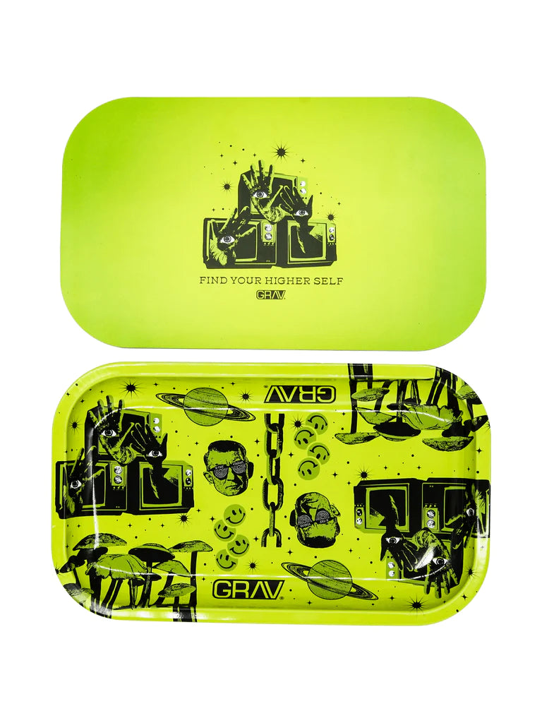 The GRAV Rolling Tray is crafted from sturdy metal and boasts a magnetic lid, ensuring your rolling supplies stay in place while you roll one up. The vivid chartreuse green color and unique illustrations on the interior and exterior of the tray give it a cool, 90's psychedelic internet feel that will transport you to a nostalgic smoke session.