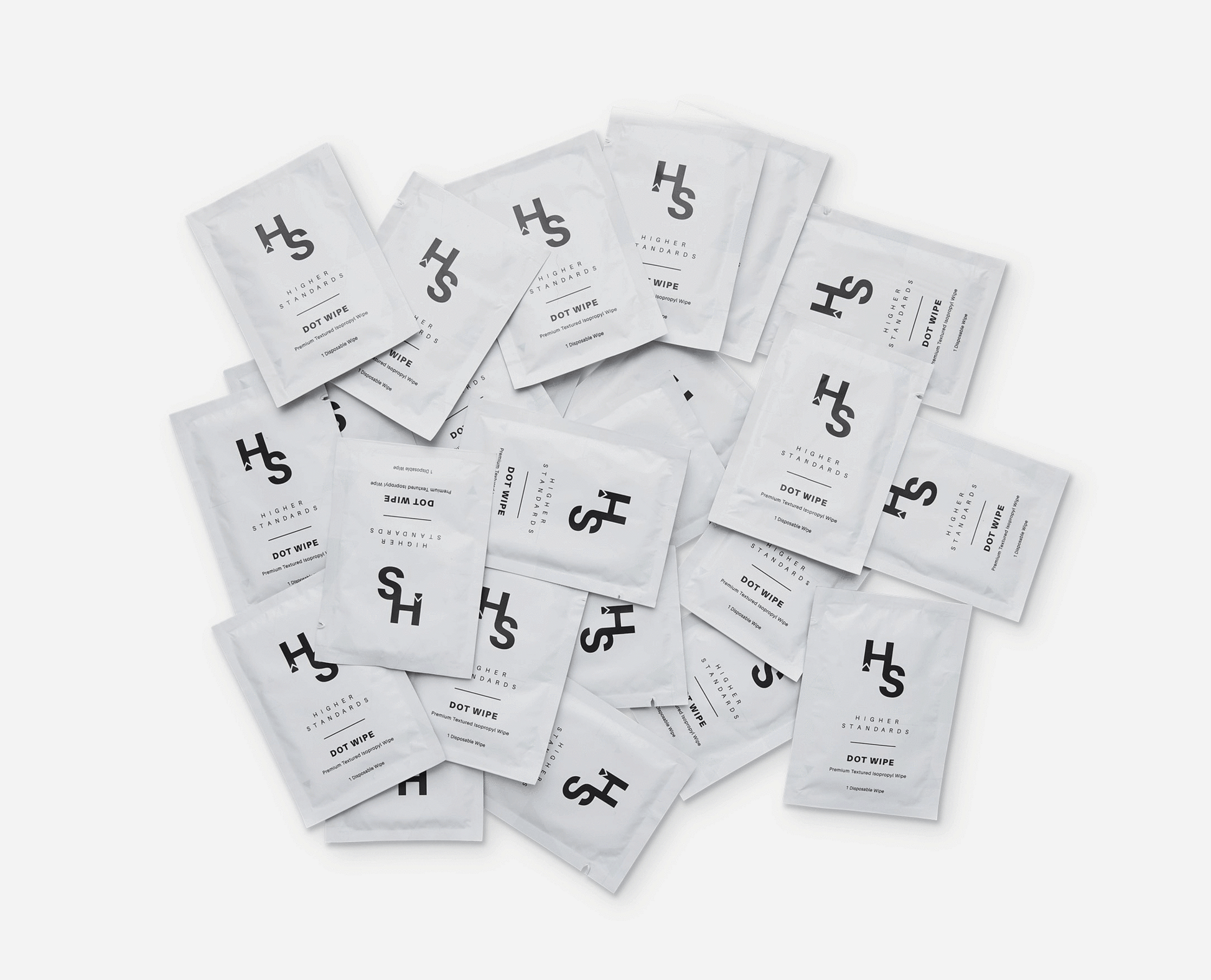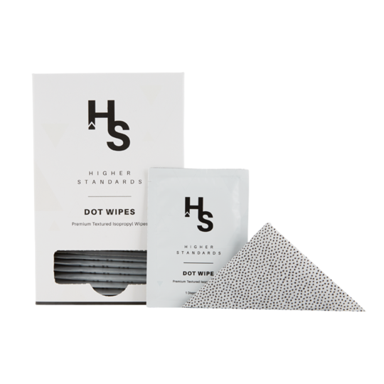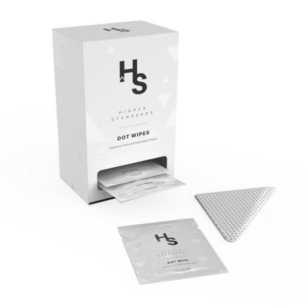 Dual-textured and durable, Higher Standards Dot Wipes are pre-soaked alcohol pads embedded with small dots to tackle stubborn scrubbing jobs. Featuring a 70% Isopropyl Alcohol solution, these textured wipes can be used on most glass, metal and silicone surfaces. The textured side is for removing heavy buildup, whereas the softer side is for polishing and touching up. Large in size, Dot Wipes can be folded into any shape for flexible usage.