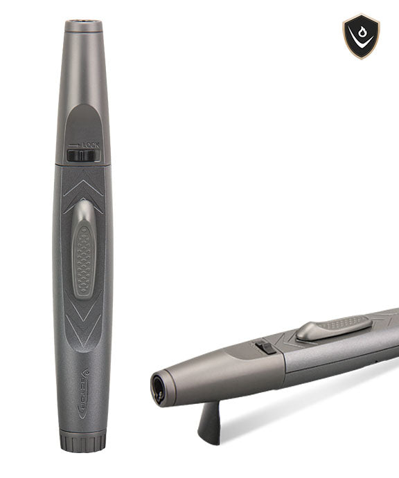 Comfortable get a powerful flame to meet your torch needs with this handy 6.5″ Vector torch lighter! This Avenger torch is both sleek and stylish, as well as easy to use and handle. Adjust the intensity of the butane flame with the dial at the end of this torch, and then you can comfortably rest your thumb on the grooved switch to turn it on. Even better, this torch features a small flip out stand so that you can use this torch hands-free! With an easy to understand design and reasonable price point, this Vector torch will become a sleek new favorite to any collection.