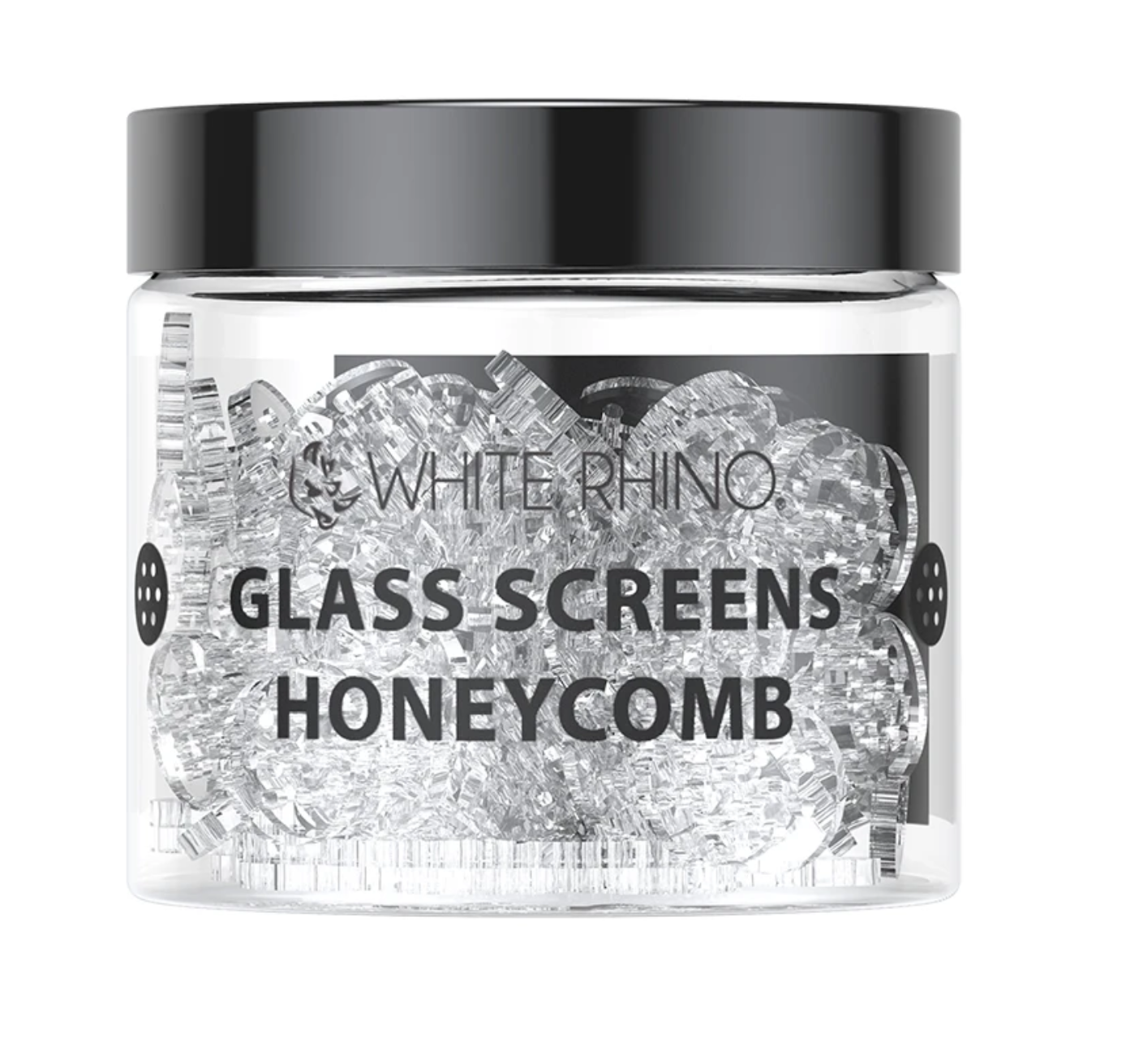 White Rhino glass honeycomb screens come in a 20 pack bag or 200 count glass jar. These screens are .375" X .375"